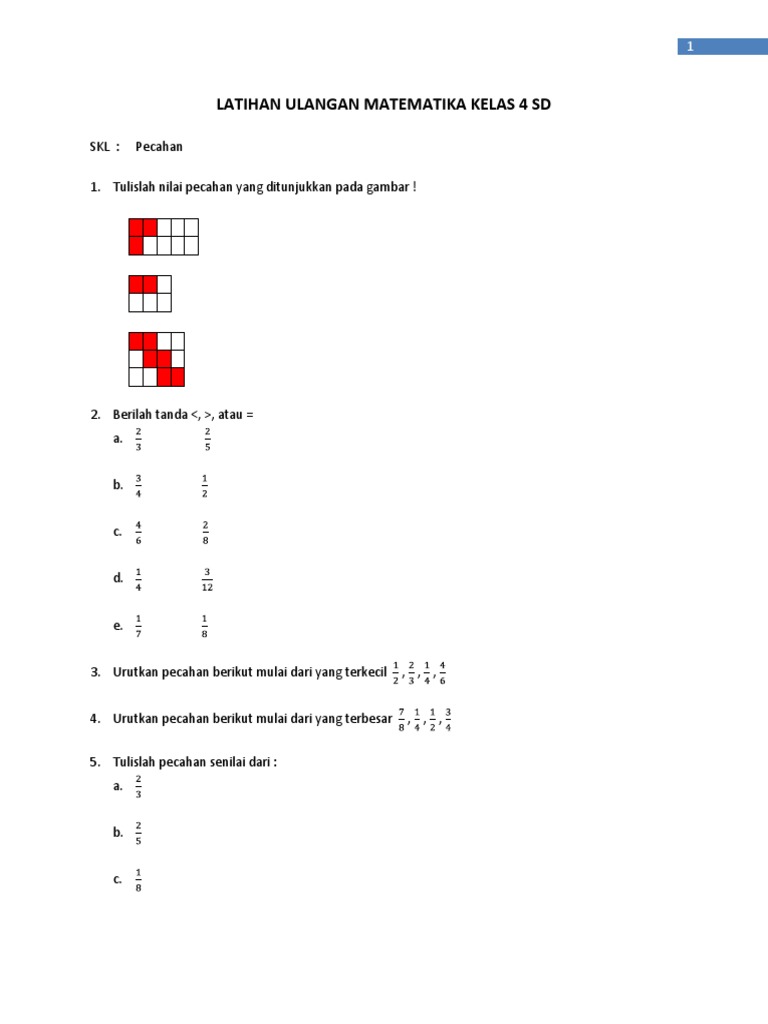Soal matematika pecahan senilai kelas 4 sd. Satu bambu dipotong menjadi 5 bagian sama panjang. Contoh soal latihan pecahan senilai matematika kelas 4 sd ini sengaja disajikan sebagai bahan pembelajaran secara online agar kalian bisa lebih memahaminya dengan banyak berlatih. Pecahan kumpulan materi kelas 4 sd. Khususnya terkait arti pecahan, pecahan senilai dan juga bagaimana cara. Bilangan pecahan merupakan suatu bilangan bagian dari seluruh nilai. Kumpulan soal pecahan matematika kelas 4 sd : Cara mengubah pecahan ke dalam desimal dan sebaliknya. Satu buah apel dipotong menjadi 2 bagian sama besar. Anda bisa mendownload nya disini. Operasi hitung pecahan biasa campuran desimal dan persen. Operasi hitung pecahan biasa kumpulan rumus matematika. Dibawah ini terdapat beberapa contoh soal kelas 4 mengenai soal matematika untuk membantu soal matematika kelas 4 tentang pecahan, soal matematika kls 4 bangun segi banyak.